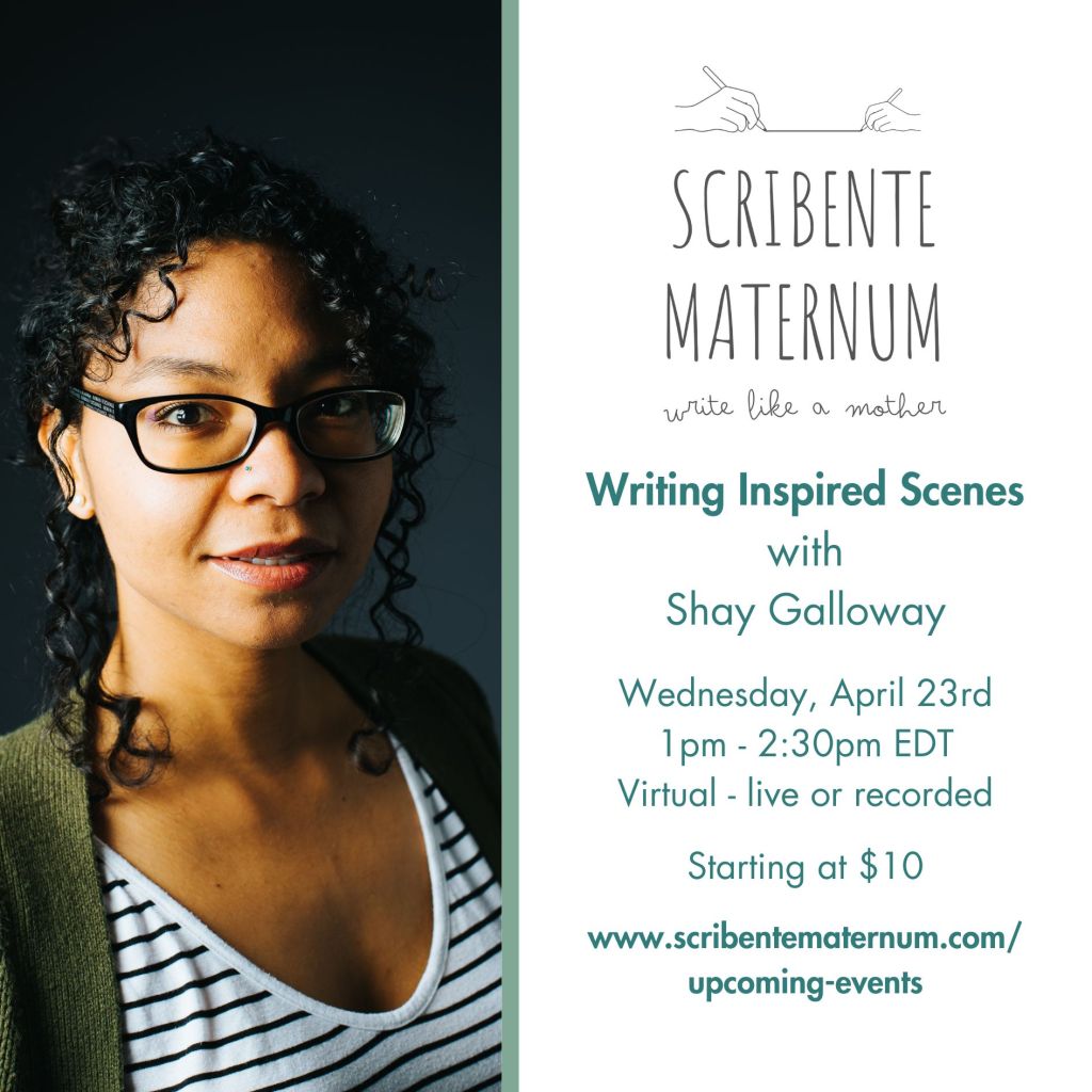 If you are a writer, I will be hosting a workshop on writing emotionally compelling scenes through action, dialogue, description and poetic prose for the organization Scribente Maternum on April 23, from 1-2:30 pm EDT.
